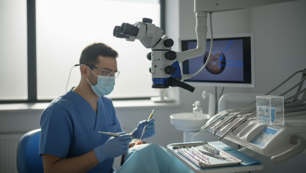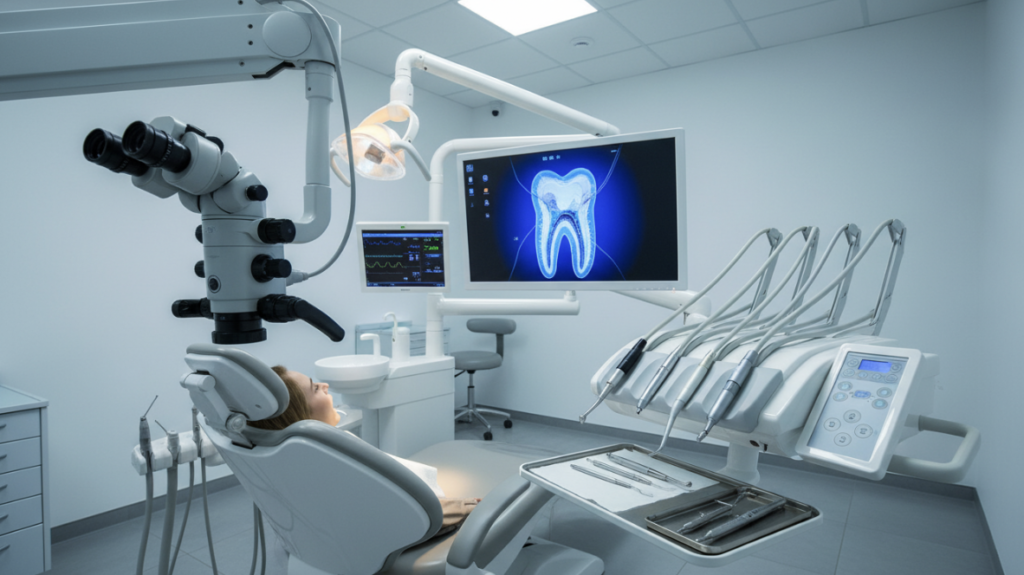 当院では、歯科用顕微鏡「マイクロスコープ」を使用することで、肉眼では見えない根管の細部まで確認しながら治療を進めています。最大数十倍まで視野を拡大できるため、細菌の取り残しを減らし、再治療のリスクを抑えやすくなります。