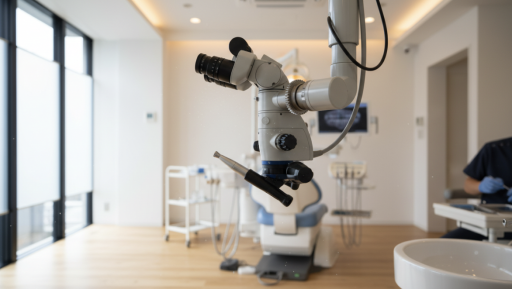 マイクロスコープは、肉眼の最大20倍まで拡大して見ることができる歯科用顕微鏡です。根管内部の細部まで確認しながら治療を進めるため、感染源の取り残しを防ぎ、再発リスクを大幅に低減できます。